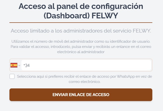 2.- Además, y principalmente como alternativa si el administrador no tiene acceso a su teléfono móvil y cuenta de WhatsApp, también puedes acceder a través de nuestra página web. En el menú hamburguesa de arriba a la derecha, puedes seleccionar acceder al «dashboard». Te aparecerá una pantalla de autenticación como la que ves abajo. Ahí, simplemente tienes que introducir tu teléfono móvil de administrador y pulsar el botón para que se te envíe al correo electrónico del administrador un enlace con el token de acceso temporal al dashboard. Además, marcando el tic que tiene la ventana, enviaremos el enlace por WhatsApp en vez de por correo electrónico. Si durante las siguientes 24 horas después de acceder, vuelves a hacerlo, podrás hacerlo sin necesidad de solicitar un nuevo token.