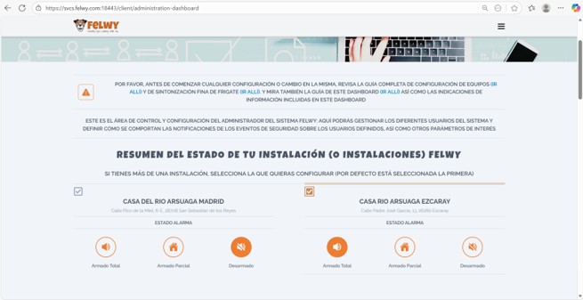 Lo primero que verás (foto abajo) en el dashboard es un resumen del sistema y en qué modo se encuentra, su nombre y dirección. Si tienes más de un sistema FELWY, podrás seleccionarlos para visualizarlos y configurarlos. Además, podrás modificar su estado. Es decir, puedes armar (parcial o totalmente) o desarmar los sistemas desde si te resulta más cómodo (que no creemos) que hacerlo por WhatsApp.