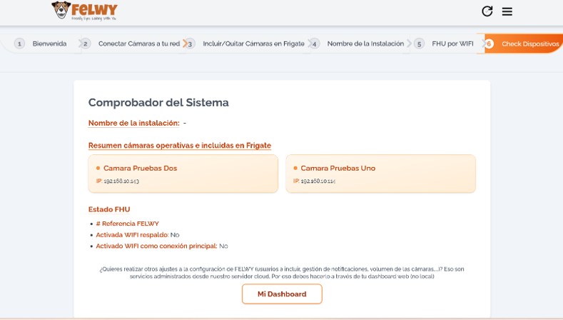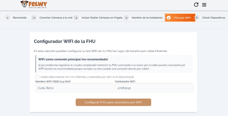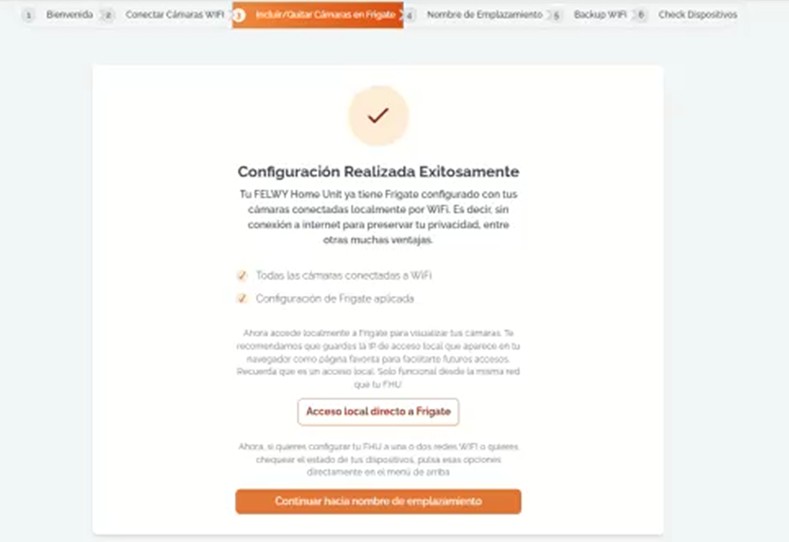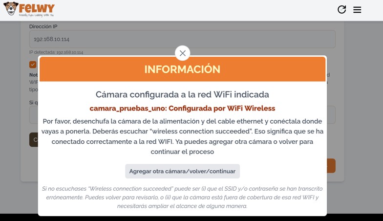 Una vez hecho, puedes darle al botón de «configurar cámara». Verás que se lanza un proceso que es para transmitirle los parámetros WIFI a la cámara y que al desconectarla de la red ethernet (si no has desmarcado el tic) se conecte a la red WIFI. Ahora llegarás a una pantalla de información como la de abajo que te explica que desconectes la cámara del cable a ethernet al router y la enchufes donde vayas a ubicarla hasta escuchar «wireless connection succeded» que indicará que ya está conectada localmente a tu red WIFI y que puedes continuar para configurar otra o seguir el proceso pulsan el botón para ello. Al hacerlo, el sistema ya reconoce la IP definitiva que Frigate necesitará para gestionar las señales de video de cada cámara. Todo confidencialmente entre tú y tu FHU. Sin que nada trascienda de tu entorno local.
